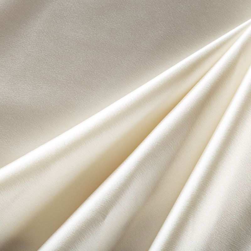 Итальянский костюмно-плательный атлас ватуссо молочного оттенка. Ткань плотная, но пластичная, хорошо держит форму и отлично тянется, собирается в красивые складки и драпировки. Почти не мнется, очень удобный и практичный. Блеск умеренный, смотрится дорого, благородно. Подойдет для пошива прямых силуэтов-футляров, приталенных платьев с пышной юбкой и крупными драпировками, изделий с заложенными складками, нарядных изделий, вечерних костюмов, летнего пальто, юбки, для изготовления корсетов.