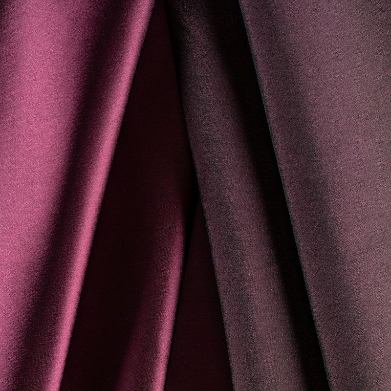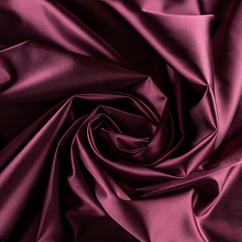 Итальянский костюмно-плательный атлас ватуссо винного оттенка. Ткань плотная, но пластичная, хорошо держит форму и отлично тянется, собирается в красивые складки и драпировки. Почти не мнется, очень удобный и практичный. Блеск умеренный, смотрится дорого, благородно. Подойдет для пошива прямых силуэтов-футляров, приталенных платьев с пышной юбкой и крупными драпировками, изделий с заложенными складками, нарядных изделий, вечерних костюмов, летнего пальто, юбки, для изготовления корсетов.