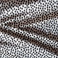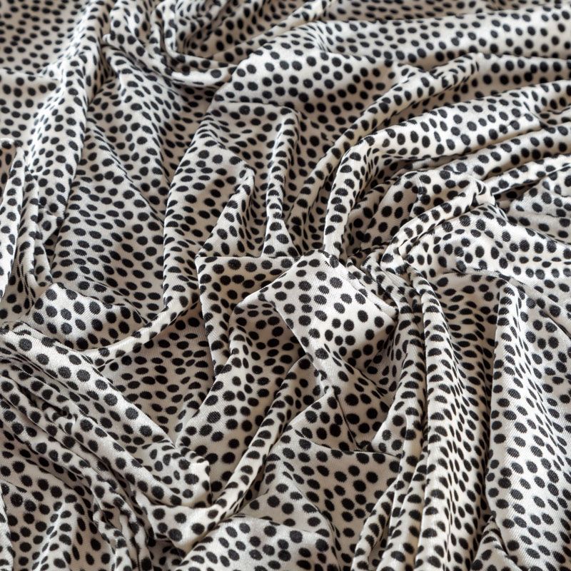 Пластичная, мягкая бархатная ткань с мелким принтом в черный горох. Ткань очень приятна на ощупь, не мнется, хорошо тянется за счет эластана в составе и драпируется. Бархат идеально подходит для пошива вечерних платьев, юбок, костюмов, а также стильных жакетов, бомберов и аксессуаров.