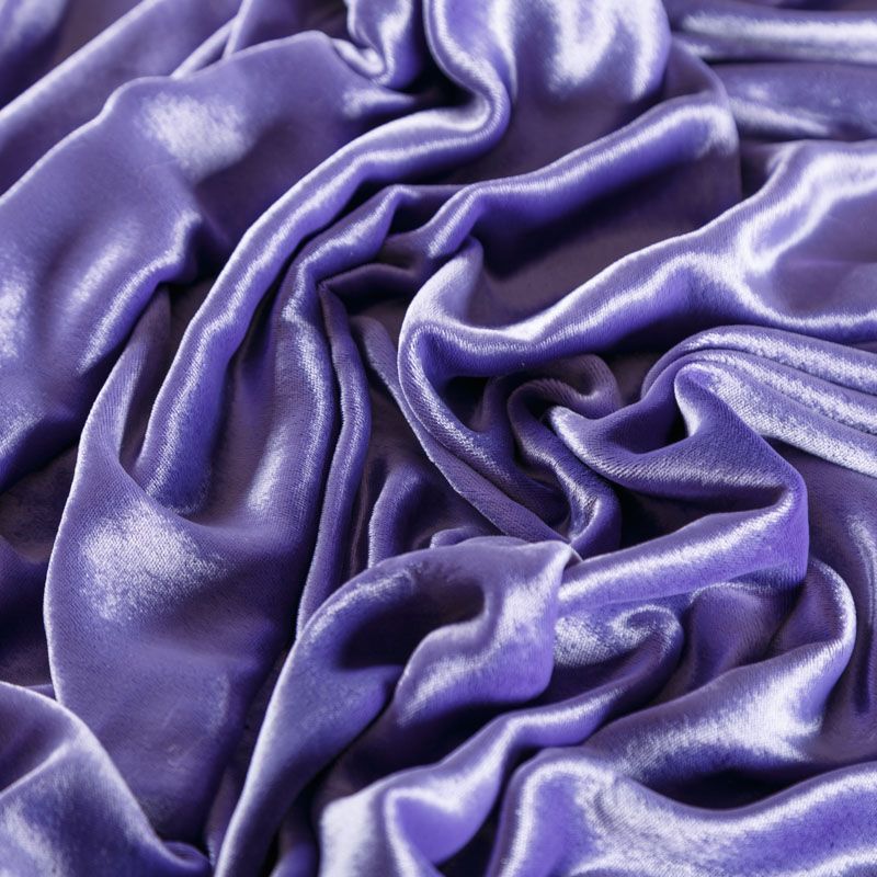 Итальянский бархат из вискозы в приглушенном темно-лавандовом оттенке. Ткань обладает мягким блеском, очень шелковистая и приятная на ощупь, не тянется, не просвечивает, драпируется струящимися складками. Подойдет для пошива костюма в пижамном стиле, платья, юбки с запахом, широких брюк, мягких джоггеров, блузы или туники.