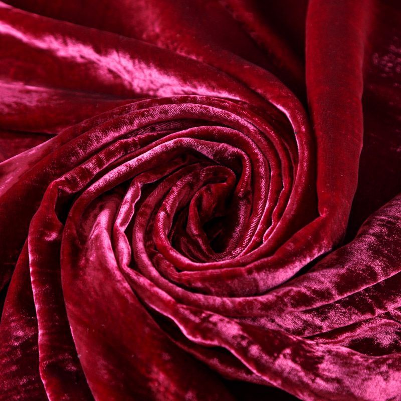 Итальянский бархат на шелковой основе в эффектном бордовом оттенке. Ткань легкая, пластичная, мягкая, с коротким и блестящим ворсом, имеющим направление, очень приятная на ощупь, прекрасно драпируется. Подойдет для платья, юбки, туники, комбинезона, свободных брюк и костюма свободного кроя.