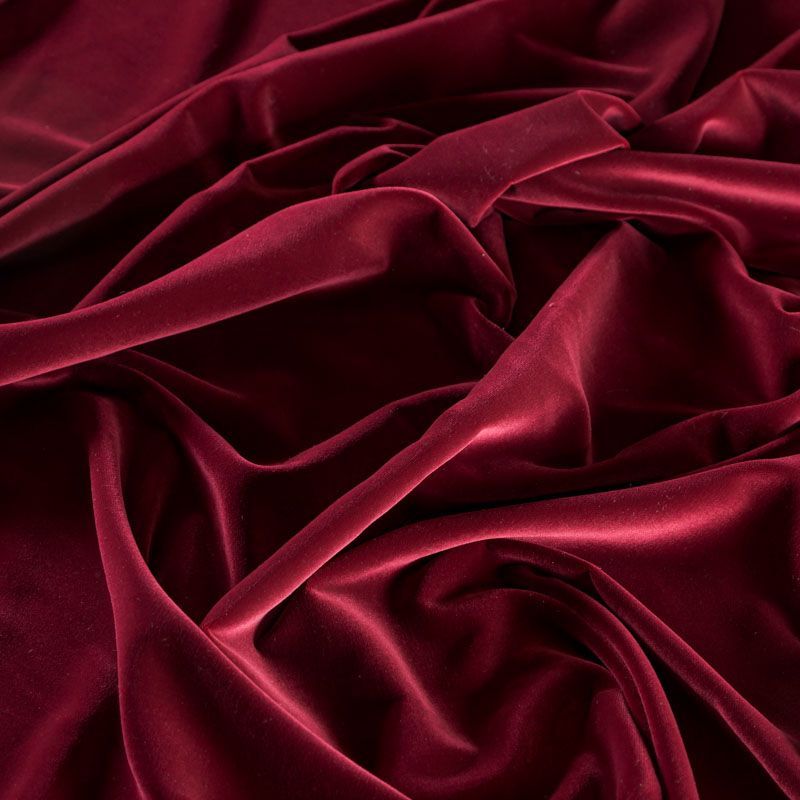 Итальянский бархат в сочном вишневом оттенке. Ткань легкая, пластичная, мягкая, с коротким и блестящим ворсом, имеющим направление, очень приятная на ощупь, прекрасно драпируется. Подойдет для платья, юбки, туники, блузки, комбинезона, свободных брюк и костюма свободного кроя.