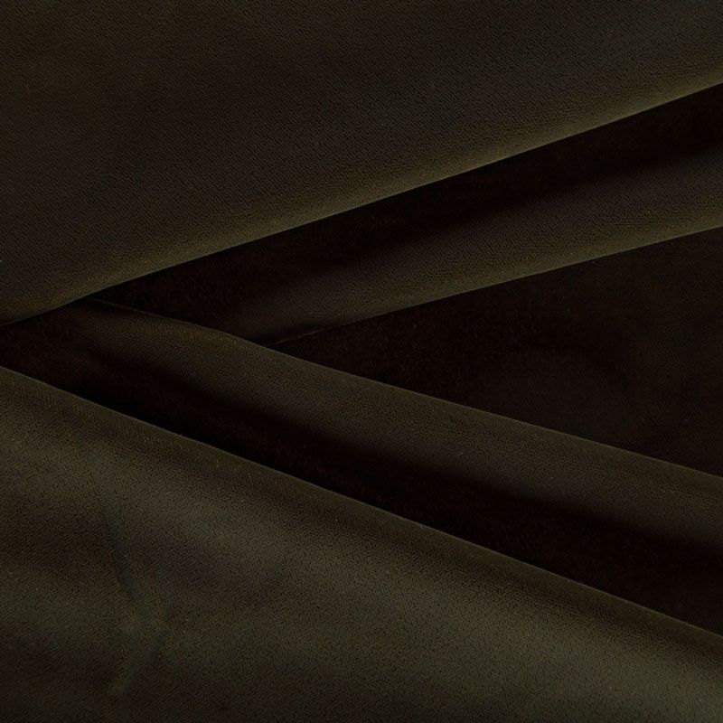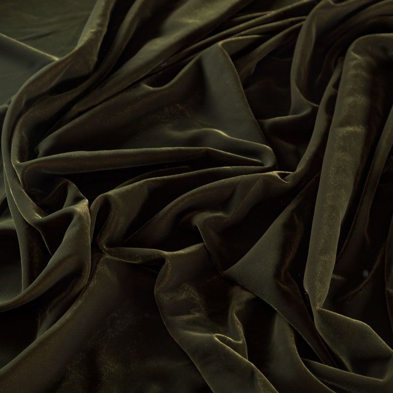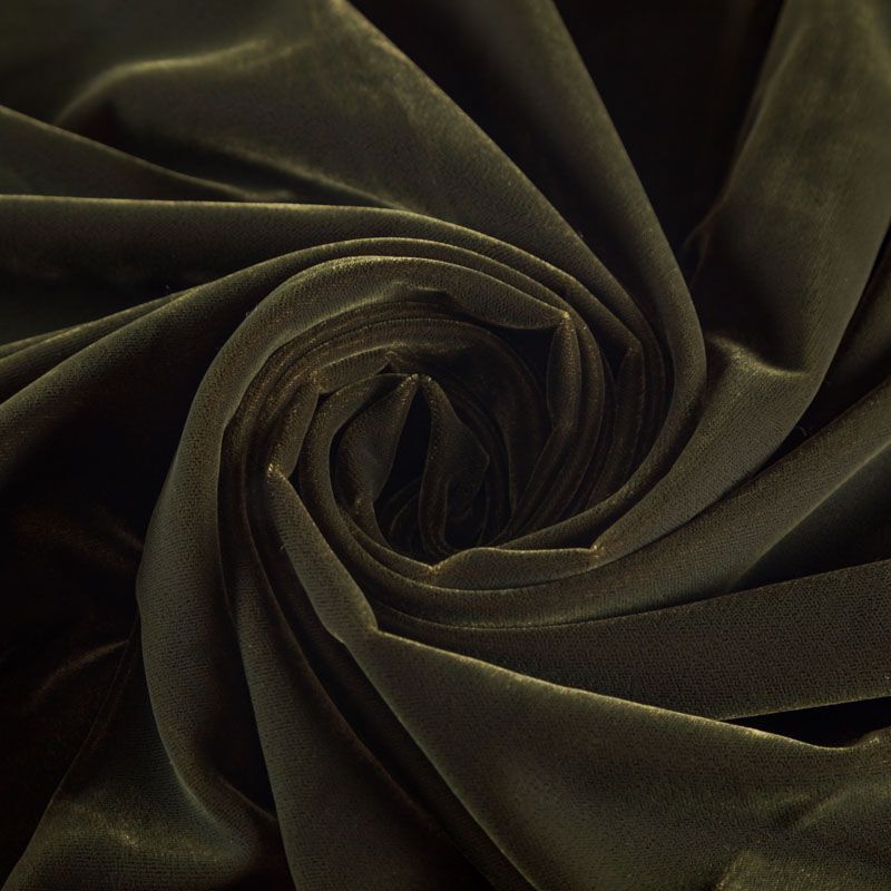Итальянский бархат в темном оттенке хаки. Ткань пластичная, мягкая, с коротким и блестящим ворсом, имеющим направление, очень приятная на ощупь, прекрасно драпируется, держит форму. Подойдет для платья, юбки, туники, блузки, комбинезона, свободных брюк и костюма.