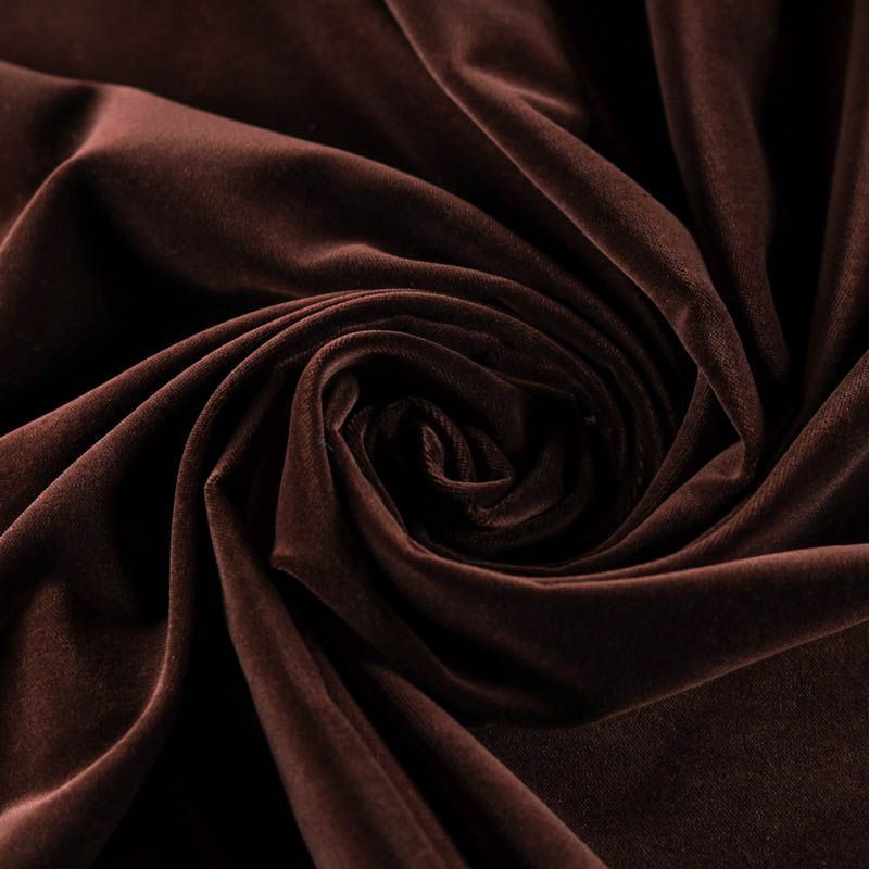 Хлопковый итальянский бархат темно-каштанового цвета. Ткань плотная, мягкая с коротким ворсом. Не грубая, хорошо драпируется. Имеет благородный матовый оттенок. Подойдет для пошива нарядного костюма, жакета, юбки, жилета, шорт, комбинезонов, брюк, платья-футляр, легкого пальто или бомбера.