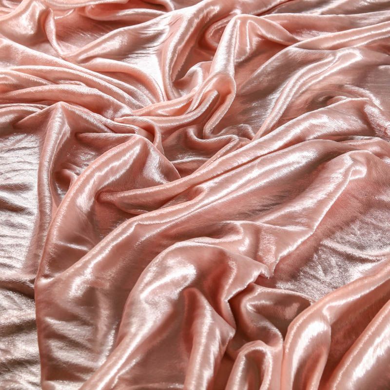 Бархат с небольшим ворсом пудрового оттенка с эффектом люрекса. Ткань очень приятна на ощупь, не мнется, мягкая, нежная, хорошо тянется и драпируется. Цвет играет отблесками и полутонами. Бархат идеально подходит для пошива вечерних платьев, юбок, костюмов, а также стильных аксессуаров.