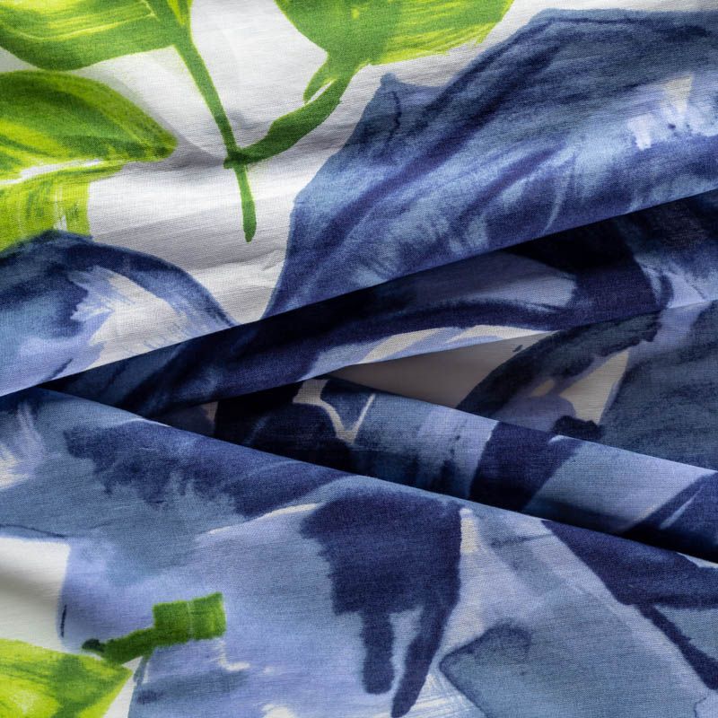 Ткань прозрачная, приятная на ощупь, нежная, хорошо и мягко драпируется, летящая. Хлопковый батист подойдёт для модных блуз с объёмными рукавами, летних платьев и сарафанов с длинной летящей юбкой, прозрачных рубашек, декорированных объёмными бантами. Крупный принт в виде цветов и листьев в голубых и зеленых оттенках на молочном фоне.