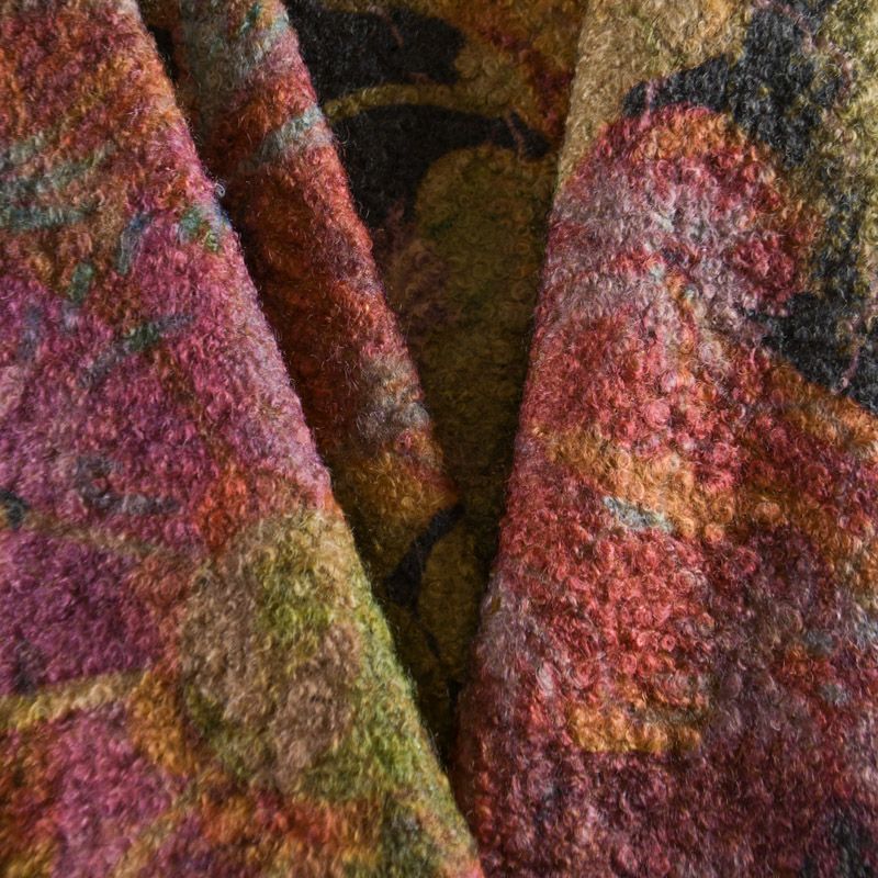 Итальянская мягкая, уютная и теплая шерстяная ткань с буклированной поверхностью с крупным флористическим принтом. Полотно пластичное, нежное, шелковистое на ощупь, не мнется, отлично драпируется, устойчиво к деформации. Отлично подойдет на пальто, кардиган, пончо, бомбер, теплый костюм и другие виды верхней одежды.