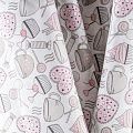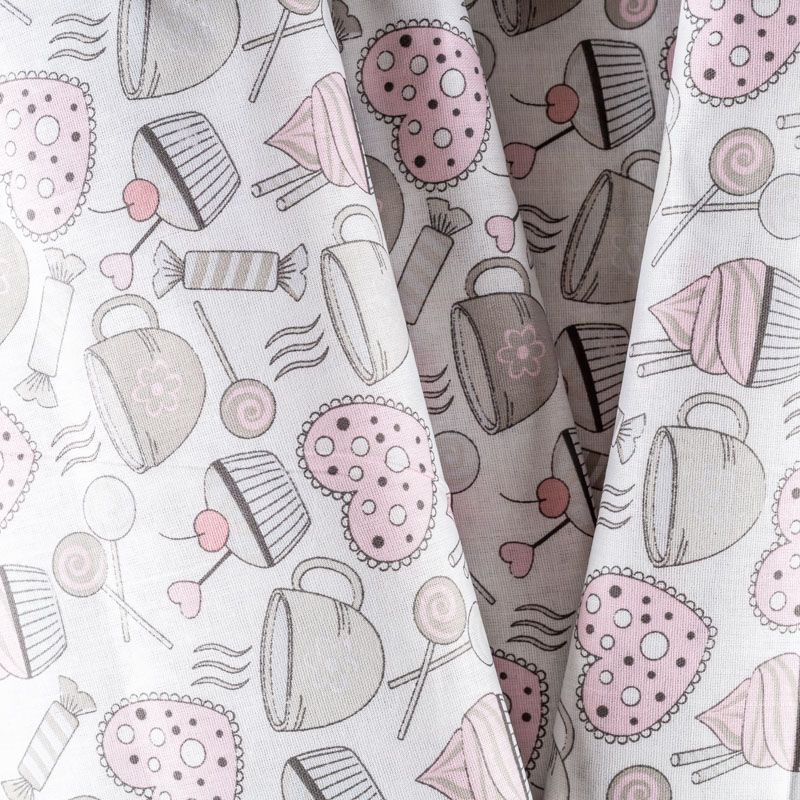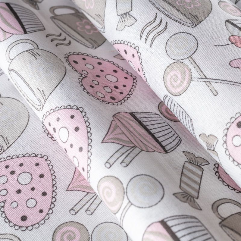 Плотная натуральная ткань с особым принципом переплетения нитей: крест-накрест. Имеет гладкую матовую поверхность чуть шероховатую на ощупь, не тянется, немного просвечивает. Прочная и стойкая к износу, надолго сохраняет яркость красок, не растягивается при стирке, практически не мнется. Нежный и милый принт в виде стилизованных сладостей в пастельных тонах на белом фоне прекрасно подойдет для пошива домашней одежды: халатов, пижамы, ночной сорочки, а также для изготовления пеленок, детского постельного белья, бортиков для кроватки.