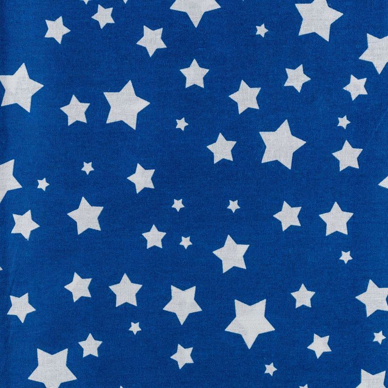 Плотная натуральная ткань с особым принципом переплетения нитей: крест-накрест. Имеет гладкую матовую поверхность чуть шероховатую на ощупь, не тянется, немного просвечивает. Прочная и стойкая к износу, надолго сохраняет яркость красок, не растягивается при стирке, практически не мнется. Принт в виде белых звездочек разного размера на глубоком синем фоне прекрасно подойдет для пошива постельного белья, изготовления пеленок, бортиков для кроватки, домашней одежды и других предметов интерьера.