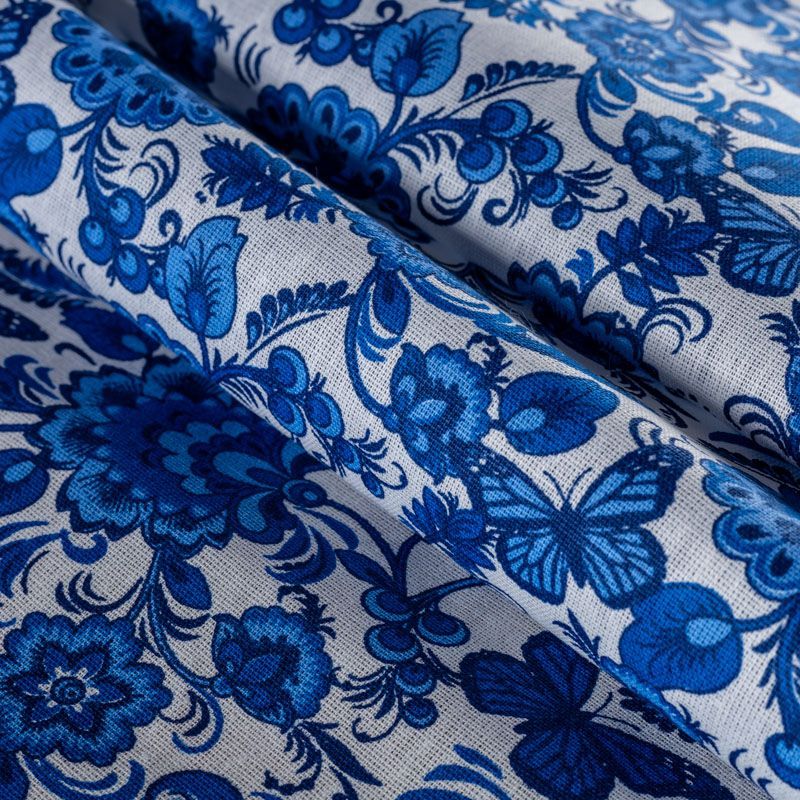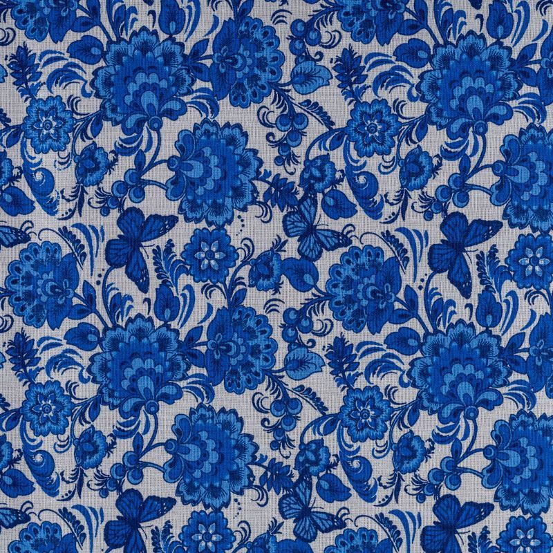 Плотная натуральная ткань с особым принципом переплетения нитей: крест-накрест. Имеет гладкую матовую поверхность, немного шероховатая на ощупь, не тянется, немного просвечивает. Прочная и стойкая к износу, надолго сохраняет яркость красок, практически не мнется. Яркий узнаваемый принт в стиле Гжель традиционного синего цвета на белом фоне прекрасно подойдет для пошива постельного белья, изготовления пеленок, бортиков для кроватки, домашней одежды и других предметов интерьера.