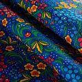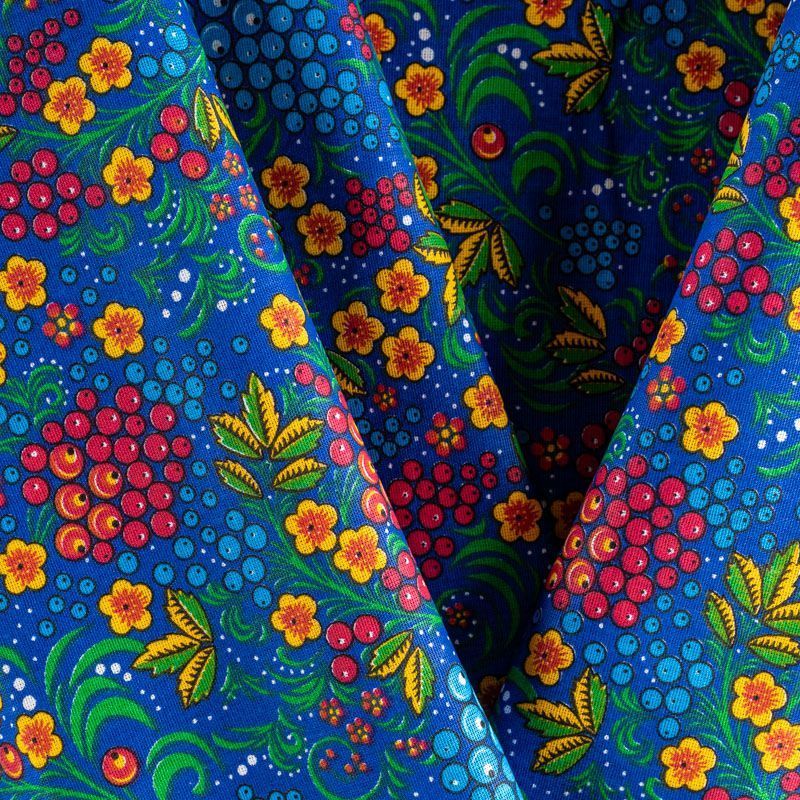 Плотная натуральная ткань с особым принципом переплетения нитей: крест-накрест. Имеет гладкую матовую поверхность, немного шероховатая на ощупь, не тянется, немного просвечивает. Прочная и стойкая к износу, надолго сохраняет яркость красок, практически не мнется. Мелкий цветной растительный принт на васильковом фоне прекрасно подойдет для пошива постельного и столового белья, изготовления сценических костюмов, домашней одежды и других предметов интерьера.
