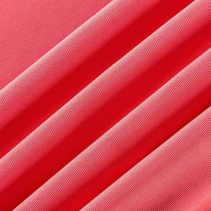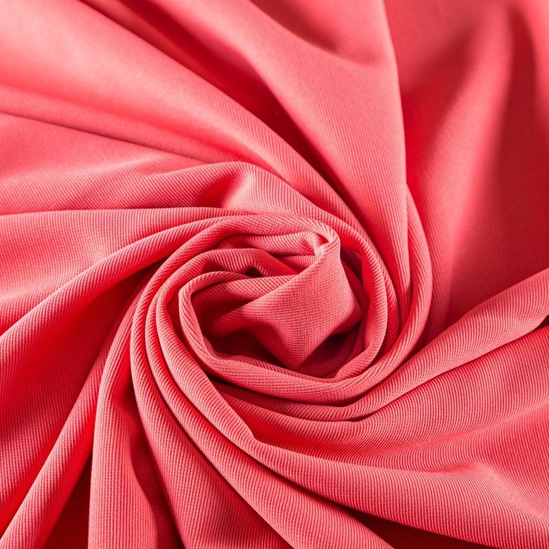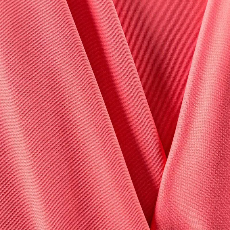 Плотное трикотажное полотно розового оттенка с коралловым подтоном. Обе стороны ткани ровные, гладкие. Материал эластичный, имеет растяжимость по всем сторонам, хорошо держит форму, уютный, приятный к телу и удобный в носке. Применяется в пошиве платьев, юбок, костюмов, жакетов.