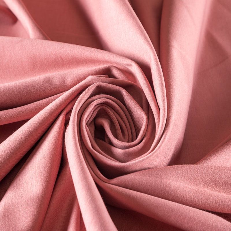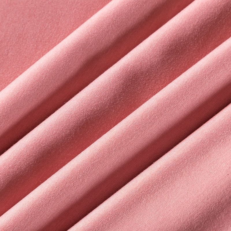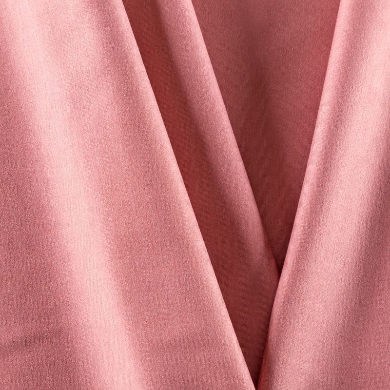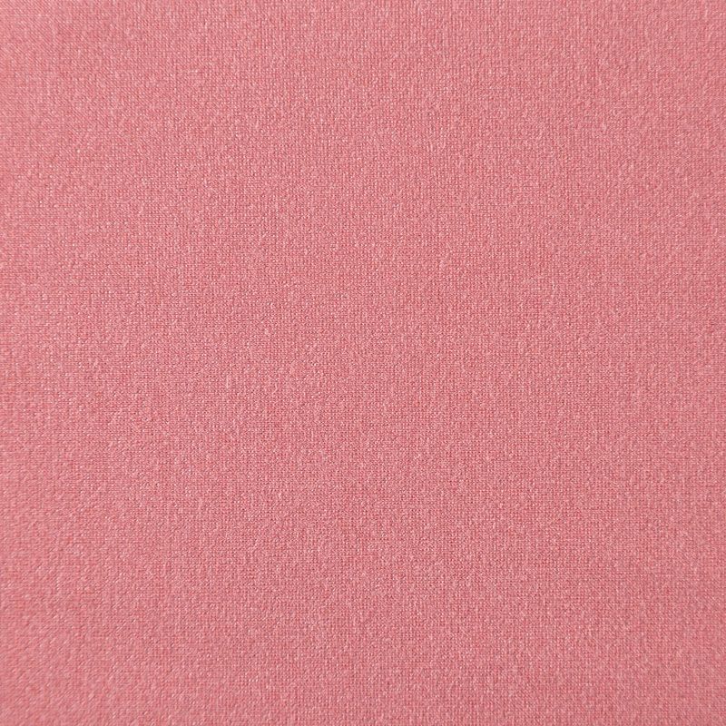 Плотное трикотажное полотно розового оттенка. Обе стороны ткани ровные, гладкие. Материал эластичный, имеет растяжимость по всем сторонам, хорошо держит форму, уютный, приятный к телу и удобный в носке. Применяется в пошиве платьев, юбок, костюмов, жакетов.