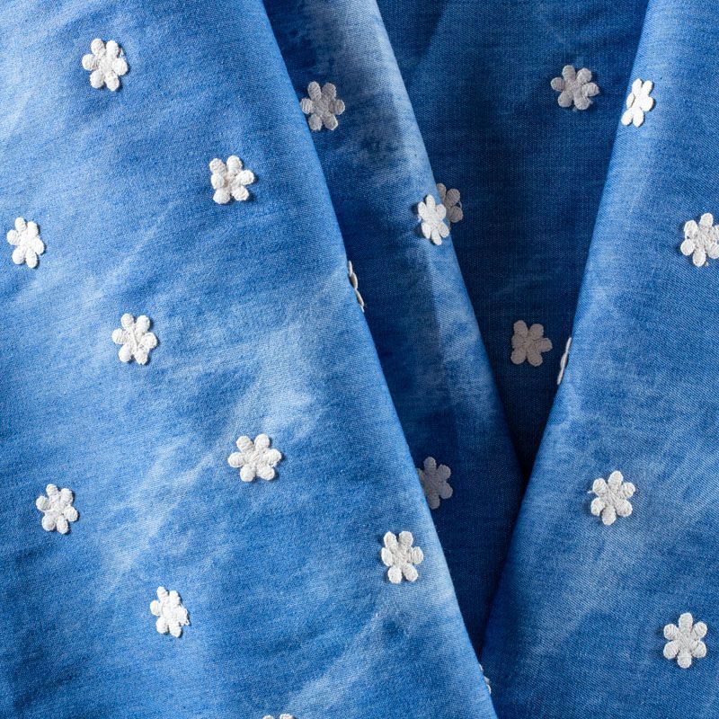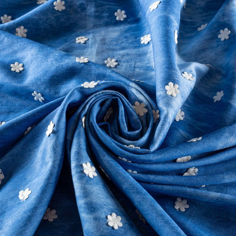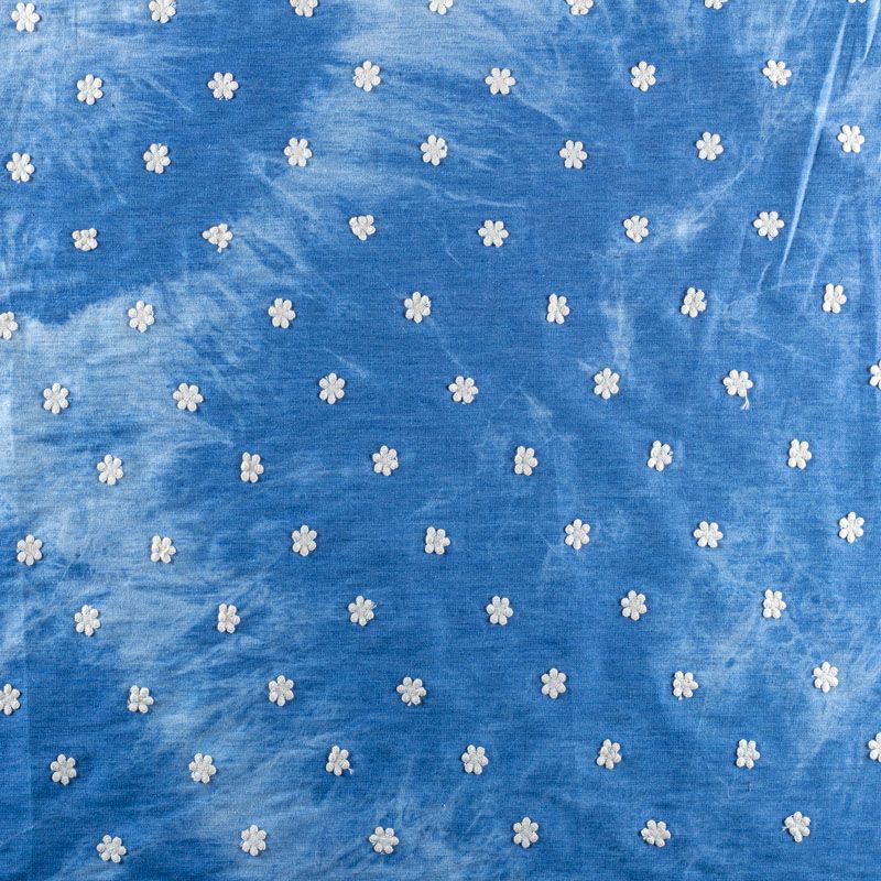 Актуальный в этом сезоне принт тай-дай на сине-голубом фоне с мелкой геометрической вышивкой белого цвета. Итальянское джинсовое полотно средней плотности, очень пластичное, не держит форму. Материал отлично драпируется, формируя мягкие складки. Подойдет для прямых, расклешенных платьев, сарафанов, платья-рубашки, юбки или туники.