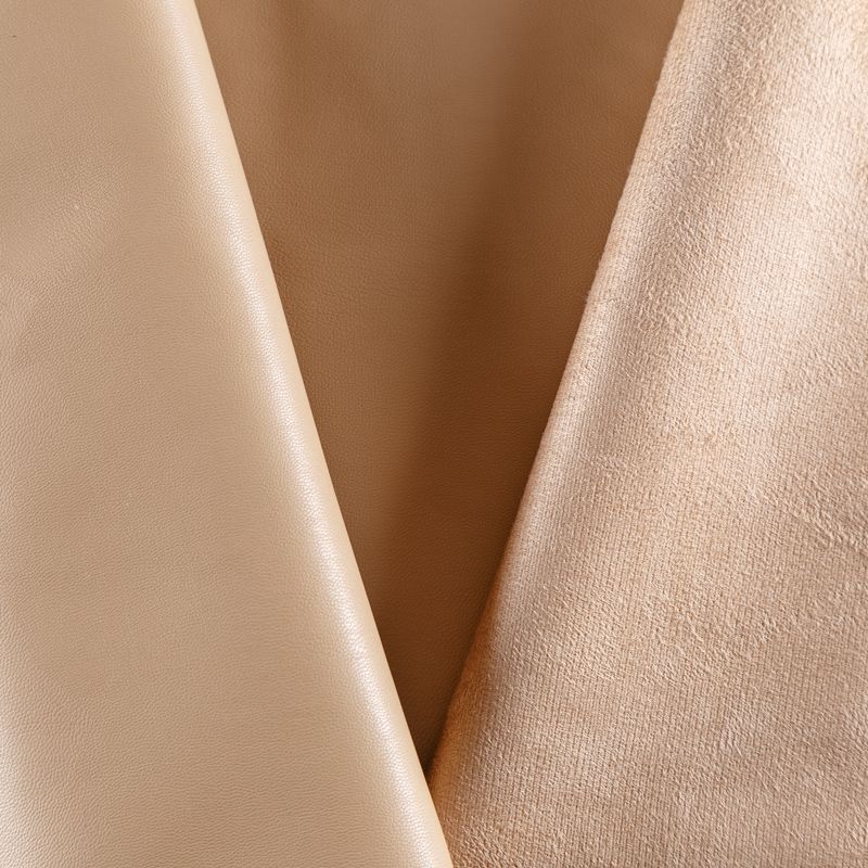 Искусственный материал, имитирующий натуральную кожу бежевого цвета. Поверхность ткани матовая, гладкая, изнаночная сторона с имитацией светлой замши. Приятная на ощупь, тянется, не просвечивает, пластичная. Подойдет для пошива куртки, костюма, платья, юбки, брюк, шорт, комбинезона, сумки, рюкзака.