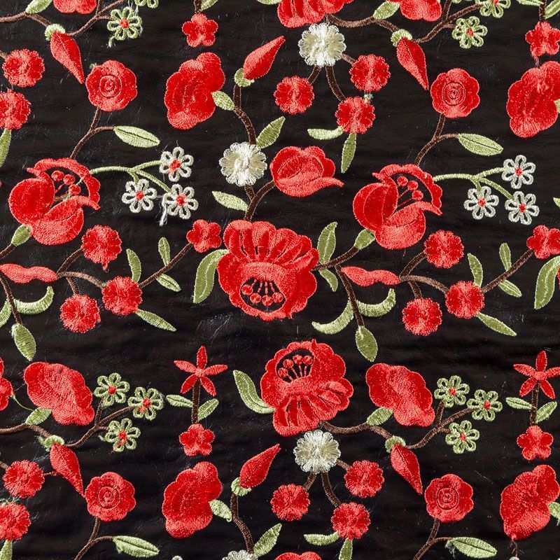 Искусственный материал, имитирующий натуральную кожу черного цвета с богатой объемной цветочной вышивкой в красных оттенках. Поверхность ткани полуматовая, гладкая. Приятная на ощупь, держит форму, не просвечивает, пластичная. Подойдет для пошива куртки, костюма, платья, юбки, брюк, шорт, комбинезона, сумки, рюкзака.