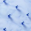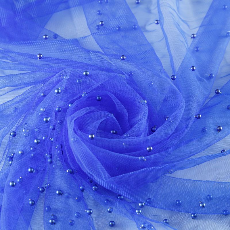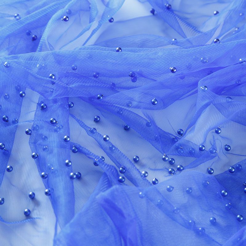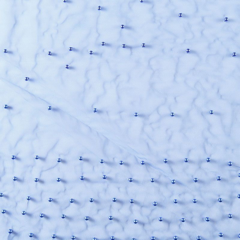 Тонкая прозрачная сетка средней жесткости фиолетового оттенка декорирована не крупными бусинами в тон полотна. Основная часть бусин расположена вдоль кромки. Ткань набирается на изделие объемом. Используется для пошива одежды для различных праздников, концертов, пышных юбок, платьев, а также для отделки и украшения, создания предметов декора и украшения помещений для торжественных мероприятий.