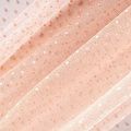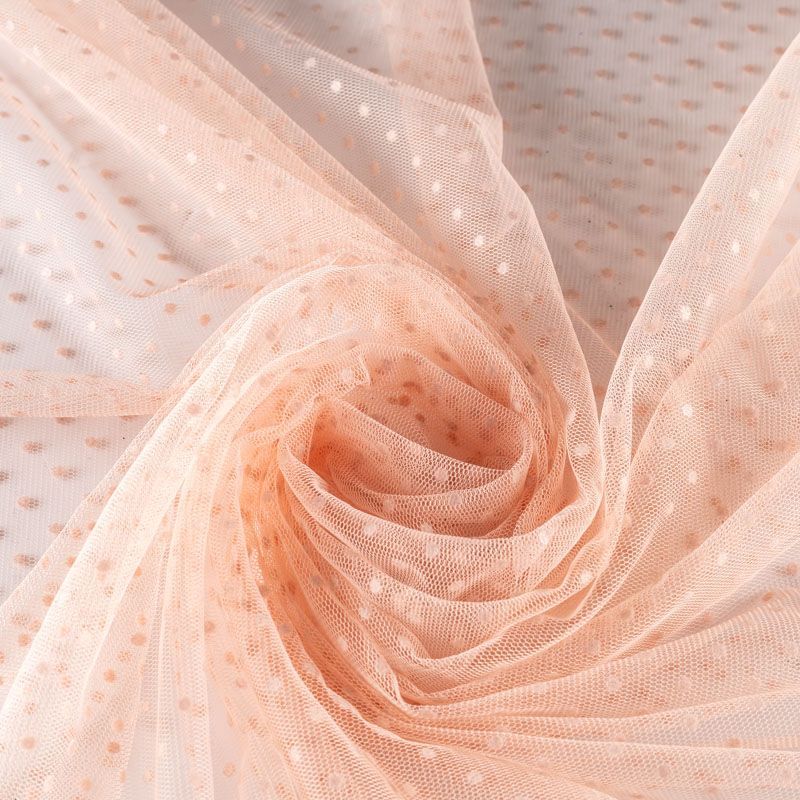 Нежный, мягкий и матовый фатин персиковго цвета. На лицевой стороне  объемные декоративные мелкие горошки из флока. Хорошо драпируется, имеет мелкое сетчатое плетение, прияный на ощупь. Из него получатся нежные и воздушные наряды — пышные юбки-пачки, коктельные или вечерние платья.