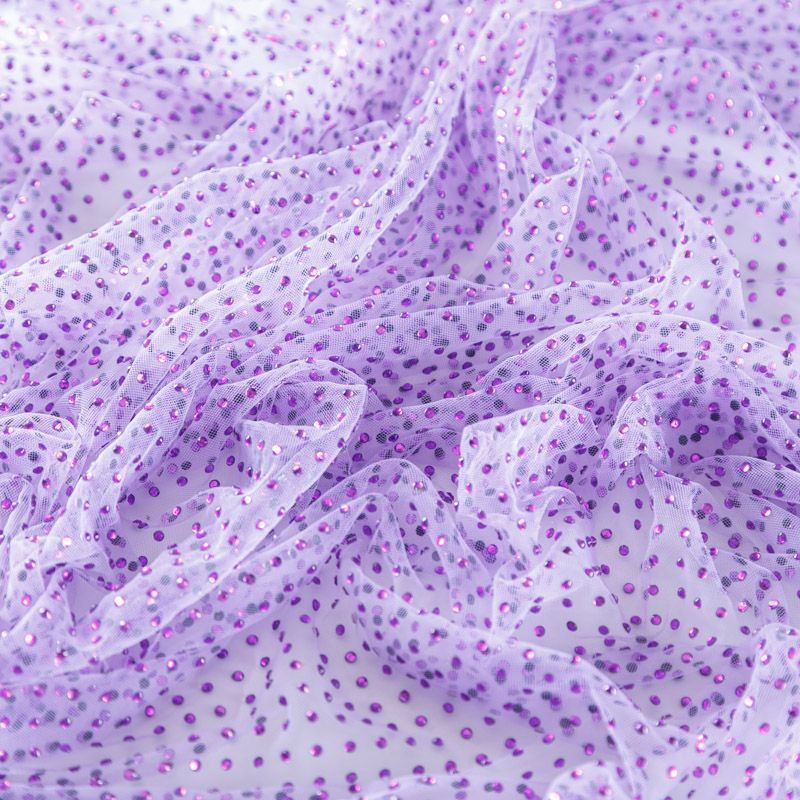 Тонкая прозрачная сетка средней жесткости сиреневого оттенка декорирована клеевыми стразами в тон полотна. Используется для пошива одежды для различных праздников, концертов, пышных юбок, платьев, а также для отделки и украшения, создания предметов декора и украшения помещений для торжественных мероприятий.