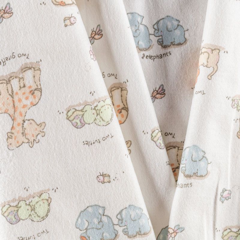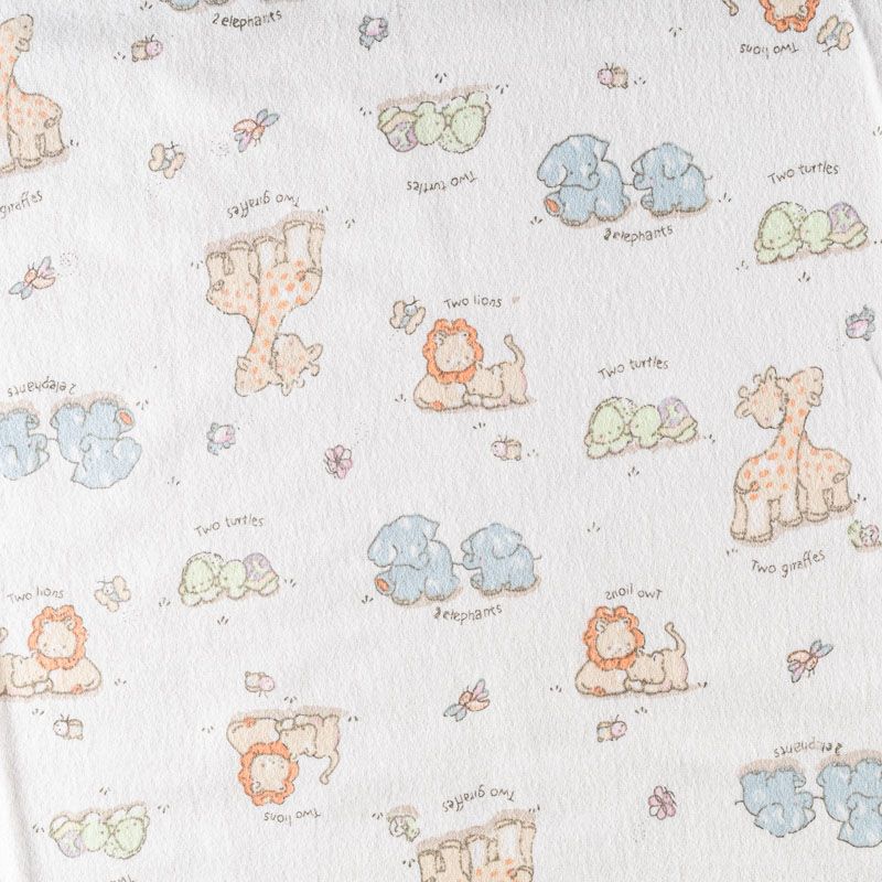 Износостойкий мягкий материал, не раздражает кожу, не садится, отлично впитывает влагу и хорошо удерживает тепло. На лицевой стороне мягкий ворс. Милый детский принт в виде рисованных тропических животных на белом фоне прекрасно подойдет для пошива постельного белья, изготовления пеленок, бортиков для кроватки, домашней одежды, пижамы и других предметов интерьера.