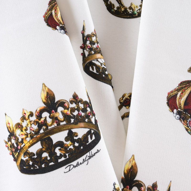 Итальянский брендовый футер с "королевским" принтом на белом фоне. Материал гладкий с лицевой стороны, с изнаночной стороны нанесен трикотажный тонкий дублерин, который дает стабильность полотну и держит форму изделий. Ткань мягкая и комфортная, достаточно эластичная, пластичная. Хорошо садится по фигуре. Практически не мнется. После растяжения быстро возвращается к прежней форме. Подойдет для пошива бомбера, легкого пальто, толстовки, спортивного костюма, джоггеров, шорт, свитшота, кроп-топа, платья в спортивном стиле.