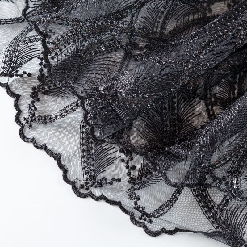 Кружевное полотно на сетчатой основе черного цвета с абстрактным узором, расположенным по ширине ткани. Тонкое, легкое, очень мягкое и пластичное, хорошо драпируется, приятное тактильно. Вышивка дополнена глянцевыми пайетками в тон. С обеих сторон ткань украшена симметричными фестонами, что придает полотну законченный и нарядный вид. Великолепно будет смотреться в нарядном вечернем, свадебном платье, платье на выпускной бал, в юбках, блузках, топах. На изделие набирается объемом.