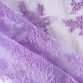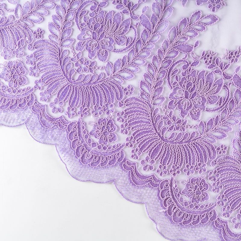 Вышивка на сетке красивого фиалкового оттенка с крупным флористическим узором. Полотно мягкое, легкое и пластичное, хорошо тянется. Сетка не жесткая, приятная к телу. Узор вышит мягкой пряжей, образуя красивую фактуру, имитирующую ручную вышивку, и оформлен кордовой нитью. С обеих сторон ткань украшена симметричными фестонами, что придает полотну законченный и нарядный вид. Великолепно будет смотреться в нарядном вечернем, свадебном платье, платье на выпускной бал, в юбках, блузках, топах. Набирается для изделя объемом.