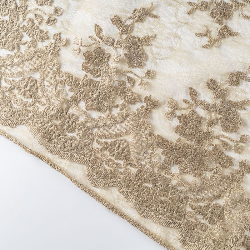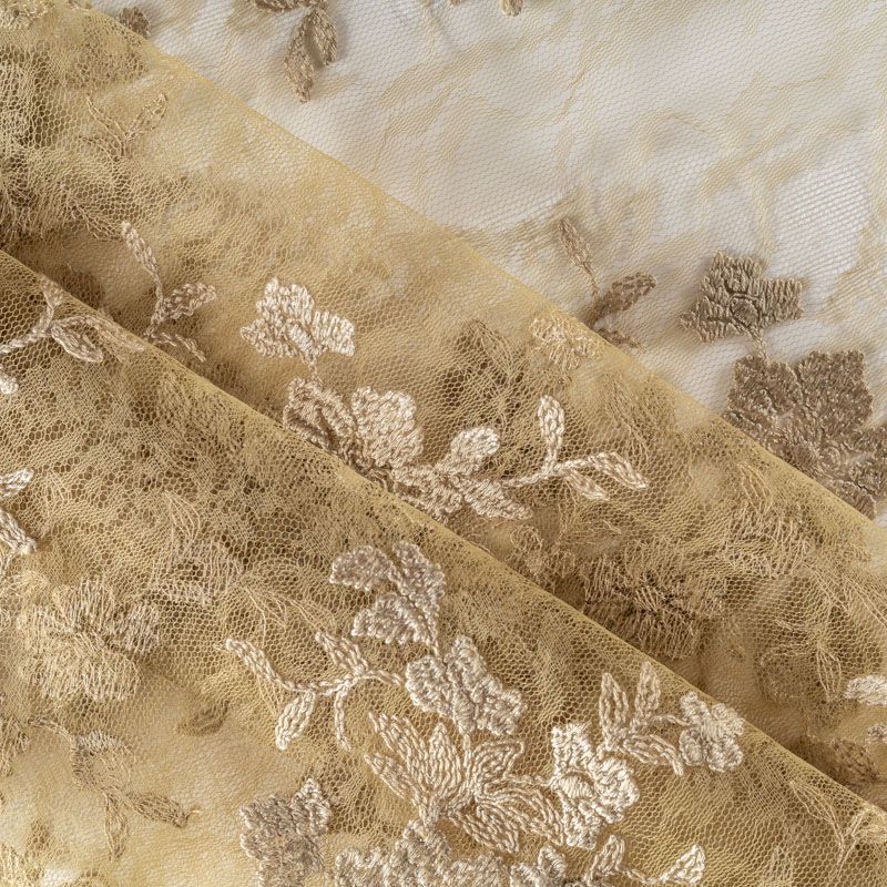 Итальянский гипюр с воздушным кружевным орнаментом, который соединяет прозрачная тонкая сетка цвета оливы. Вышивка выполнена вискозной нитью не очень плотно, поэтому полотно тонкое, легкое, очень мягкое и пластичное, хорошо драпируется, приятное тактильно. С обеих сторон ткань украшена симметричными фестонами, что придает ей законченный и нарядный вид. Великолепно будет смотреться в нарядном вечернем, свадебном платье, платье на выпускной бал, в юбках, блузках, топах.