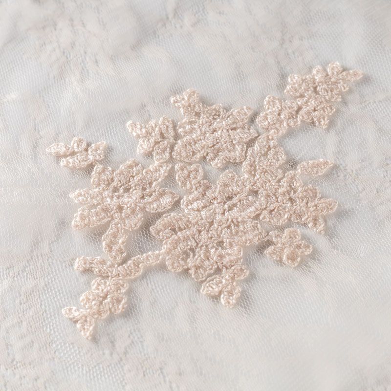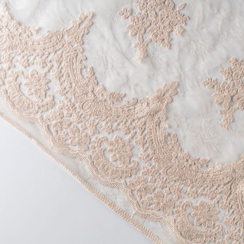 Итальянский гипюр с воздушным кружевным орнаментом, который соединяет прозрачная тонкая сетка пудрового оттенка. Вышивка выполнена вискозной нитью не очень плотно, поэтому полотно тонкое, легкое, очень мягкое и пластичное, хорошо драпируется, приятное тактильно. С обеих сторон ткань украшена симметричными фестонами, что придает ей законченный и нарядный вид. Великолепно будет смотреться в нарядном вечернем, свадебном платье, платье на выпускной бал, в юбках, блузках, топах.