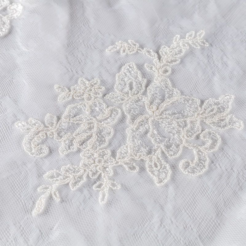 Кружевное полотно на сетчатой жаккардовой основе белого цвета с флористическим узором. Тонкое, легкое, очень мягкое и пластичное, хорошо драпируется, приятное тактильно. Вышивка оформлена кордовой нитью. С обеих сторон ткань украшена симметричными фестонами, что придает полотну законченный и нарядный вид. Великолепно будет смотреться в нарядном вечернем, свадебном платье, платье на выпускной бал, в юбках, блузках, топах. Также можно применять отдельные элементы для декора, которые вырезаются из полотна.