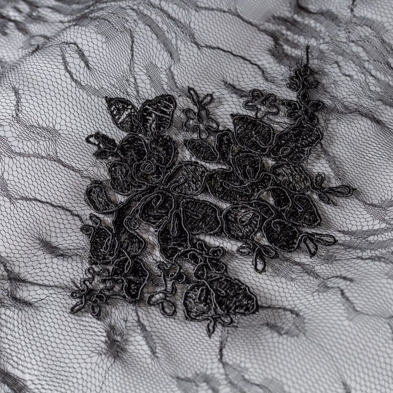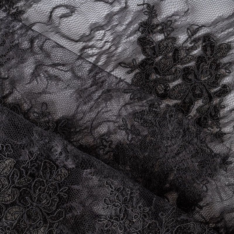 Кружевное полотно на сетчатой жаккардовой основе элегантного черного цвета с флористическим узором. Тонкое, легкое, очень мягкое и пластичное, хорошо драпируется, приятное тактильно. Вышивка оформлена кордовой нитью. С обеих сторон ткань украшена симметричными фестонами, что придает полотну законченный и нарядный вид. Великолепно будет смотреться в нарядном вечернем, свадебном платье, платье на выпускной бал, в юбках, блузках, топах. Также можно применять отдельные элементы для декора, которые вырезаются из полотна.