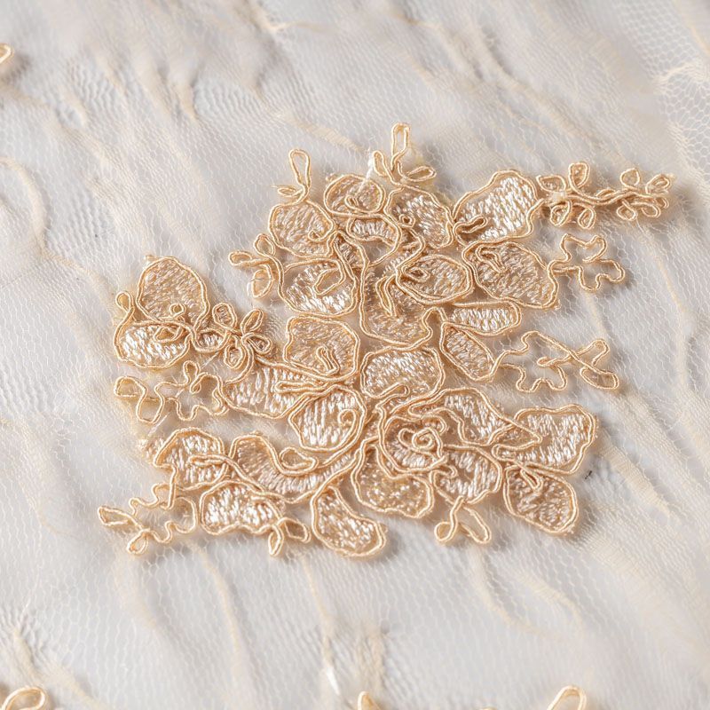 Кружевное полотно на сетчатой жаккардовой основе золотистого оттенка с флористическим узором. Тонкое, легкое, очень мягкое и пластичное, хорошо драпируется, приятное тактильно. Вышивка оформлена кордовой нитью. С обеих сторон ткань украшена симметричными фестонами, что придает полотну законченный и нарядный вид. Великолепно будет смотреться в нарядном вечернем, свадебном платье, платье на выпускной бал, в юбках, блузках, топах. Также можно применять отдельные элементы для декора, которые вырезаются из полотна.