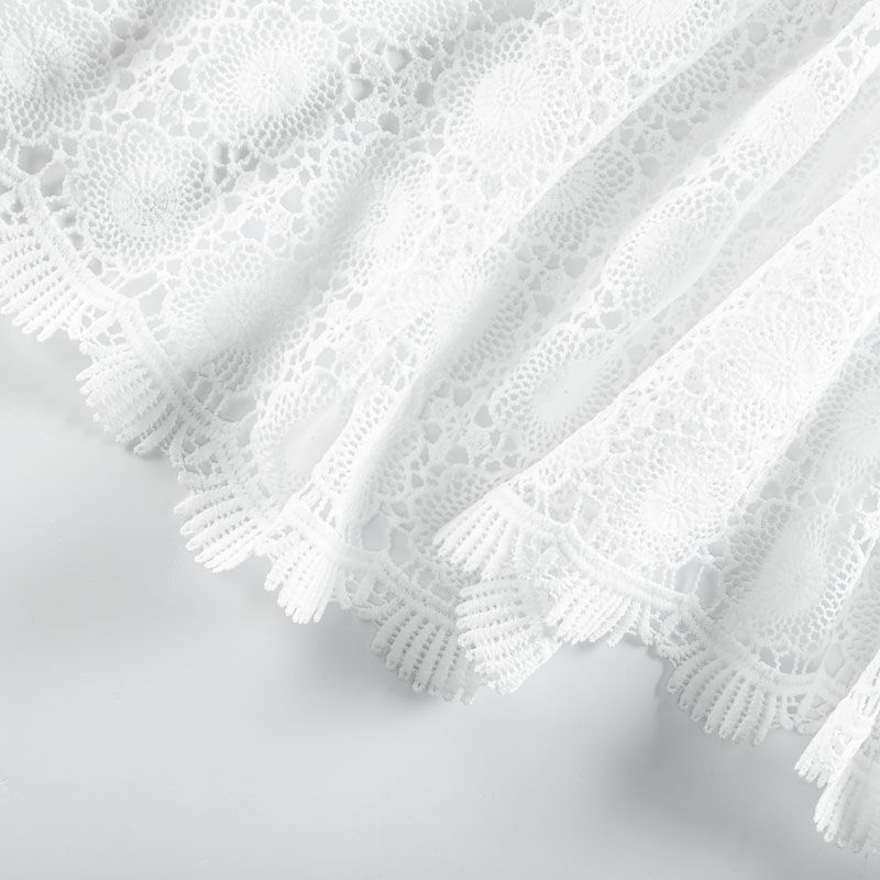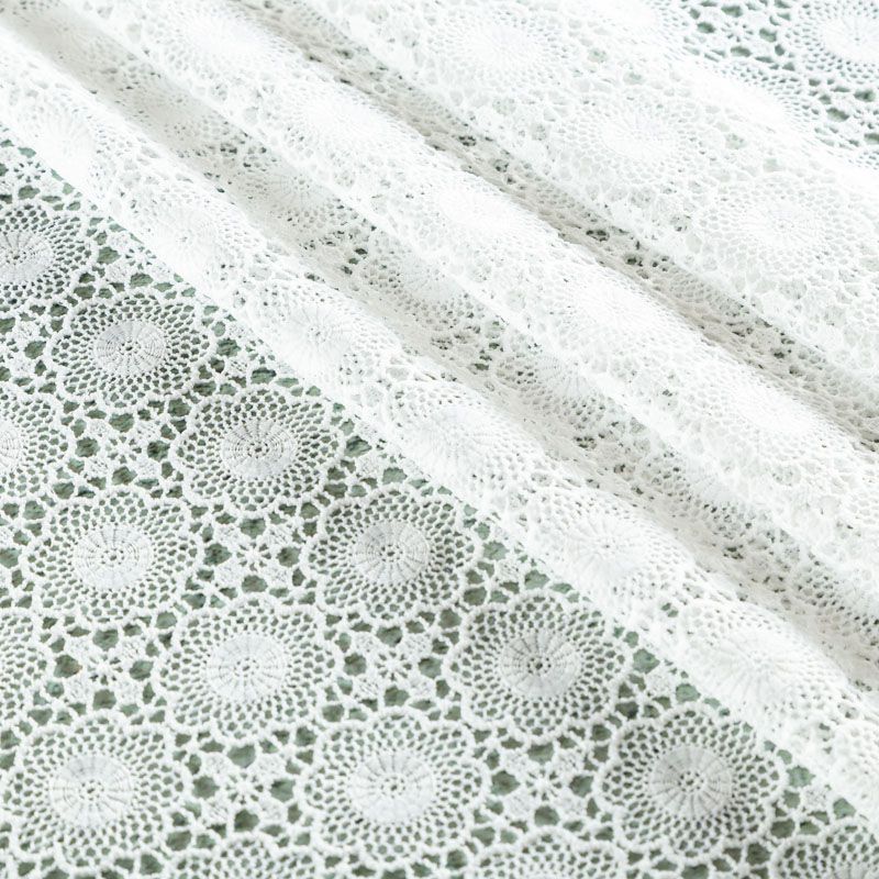 Гипюр-макраме представляет собой ажурное полотно, имеющее рельефную текстуру с цветочным ажурным плетением по всей ширине и фестонами по обе стороны кромок. Материал прозрачный на теле и на просвет, требуется подклад. Всегда актуален при создании утончённых и роскошных нарядов, придавая им дороговизны и оригинальности. Может использоваться для пошива платьев, костюмов прямого кроя, изготовления декоративных элеметов. Набирается на изделие объемом.