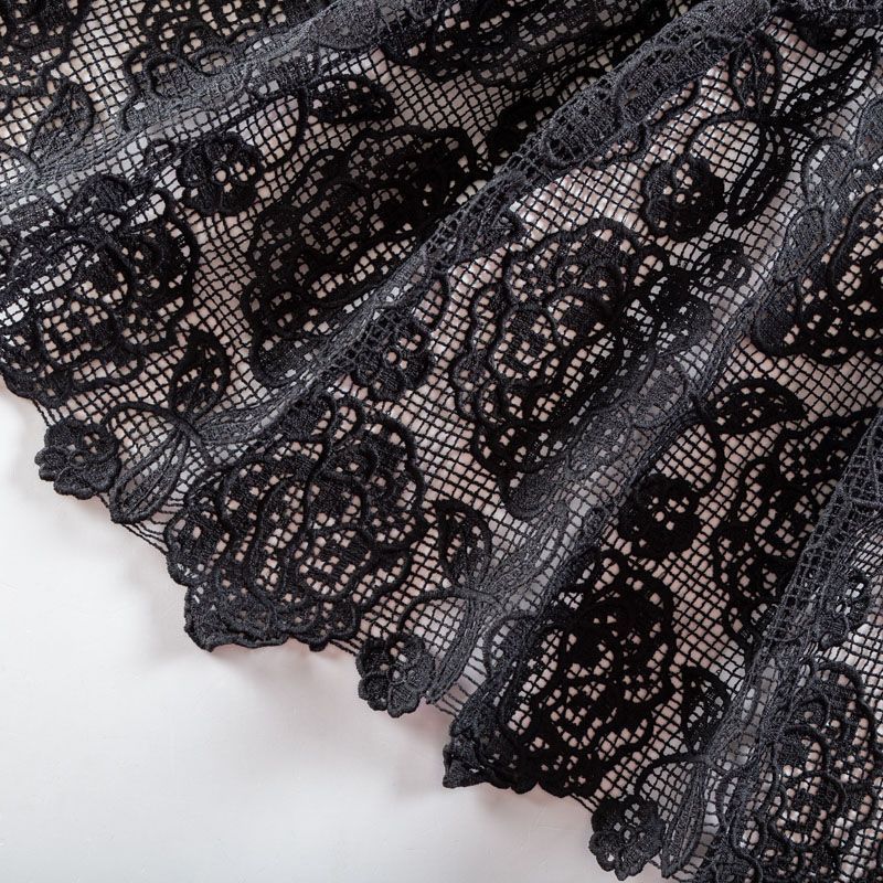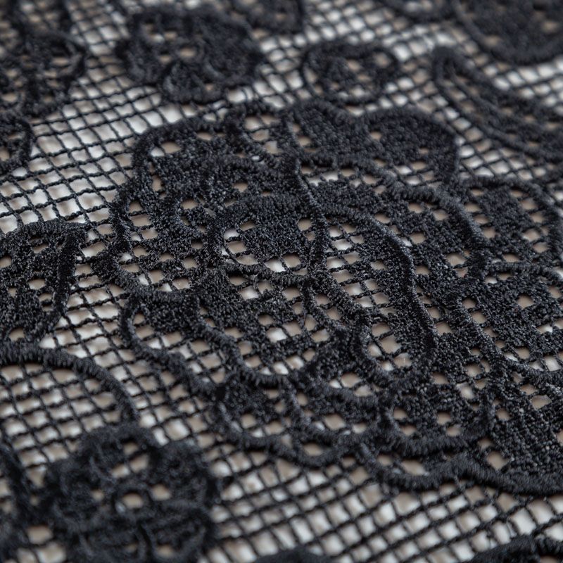 Гипюр-макраме представляет собой ажурное полотно, имеющее рельефную текстуру с цветочным ажурным плетением по всей ширине и фестоном по одной стороне кромки. Материал прозрачный на теле и на просвет, требуется подклад. Всегда актуален при создании утончённых и роскошных нарядов, придавая им дороговизны и оригинальности. Может использоваться для пошива платьев, костюмов прямого кроя, изготовления декоративных элеметов. Набирается на изделие объемом.