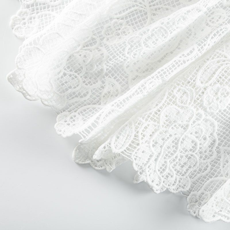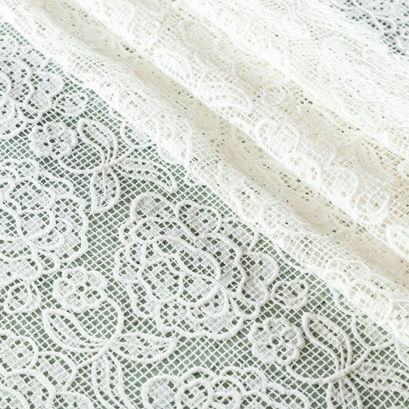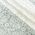 Гипюр-макраме представляет собой ажурное полотно, имеющее рельефную текстуру с цветочным ажурным плетением по всей ширине и фестоном по одной стороне кромки. Материал прозрачный на теле и на просвет, требуется подклад. Всегда актуален при создании утончённых и роскошных нарядов, придавая им дороговизны и оригинальности. Может использоваться для пошива платьев, костюмов прямого кроя, изготовления декоративных элеметов. Набирается на изделие объемом.