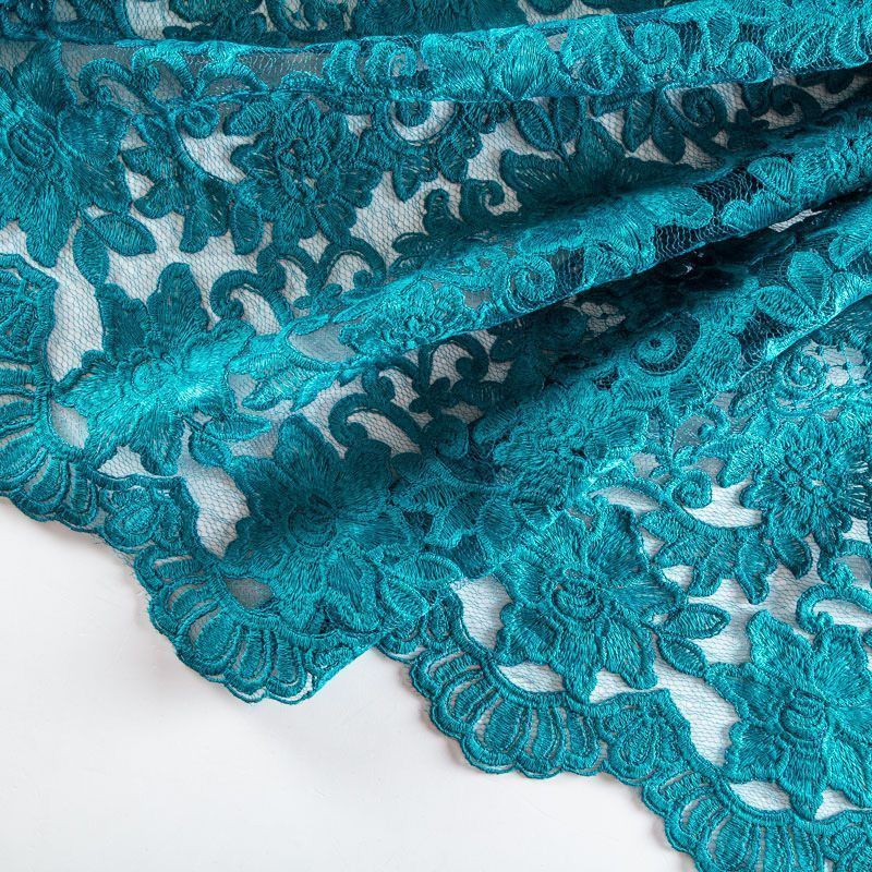 Кружевное полотно без тканной основы с цветочным ажурным плетением по всей ширине и фестонами по обе стороны кромок. Материал прозрачный на теле и на просвет, в вышивку красиво вплетена кордовая нить, которая придает текстуру, с матовым благородным блеском. Великолепно будет смотреться в нарядном вечернем, свадебном платье, платье на выпускной бал, в юбках, блузках, топах. Также можно применять отдельные элементы для декора, которые вырезаются из полотна. Набирается на изделие объемом.