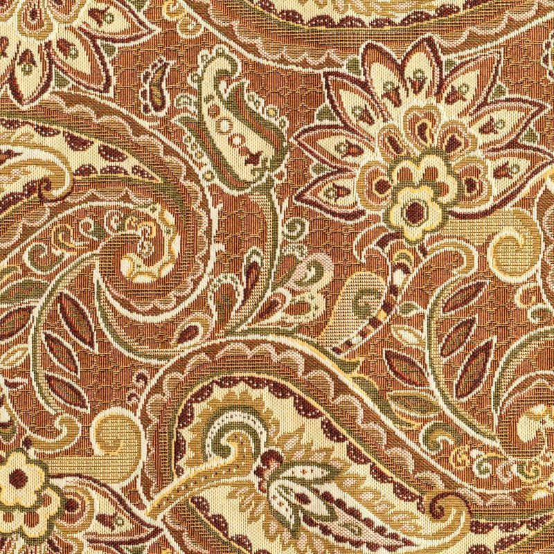Гобелен представляет собой ткань, выполненную перекрестным плетением нитей с одномоментным созданием сюжетной или орнаментальной композиции. Это плотный материал высокую прочность и износостойкость. Гобелен используют для пошива плотных светонепроницаемых штор, декоративного домашнего текстиля и аксессуаров, в мебельном производстве для обивки мебели. Так же применяется в рукоделии: модные кошельки, сумочки, пояса и другие аксессуары и при изготовлении дизайнерской одежды. На коричнево-песочном фоне растительный цветной узор в стиле пейсли.