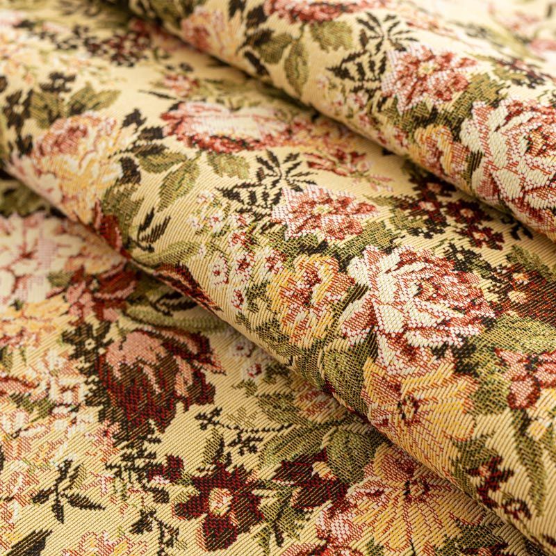 Гобелен представляет собой ткань, выполненную  перекрестным плетением нитей с одномоментным созданием сюжетной или орнаментальной композиции. Это плотный материал высокую прочность и износостойкость. Гобелен используют для пошива плотных светонепроницаемых штор, декоративного домашнего текстиля и аксессуаров, в мебельном производстве для обивки мебели. Так же применяется в рукоделии: модные кошельки, сумочки, пояса и другие аксессуары и при изготовлении дизайнерской одежды. Очень летний принт - букеты из садовых и полевых цветов на спокойном фоне натурального песочного оттенка.