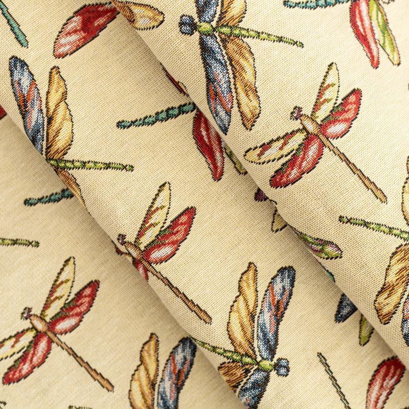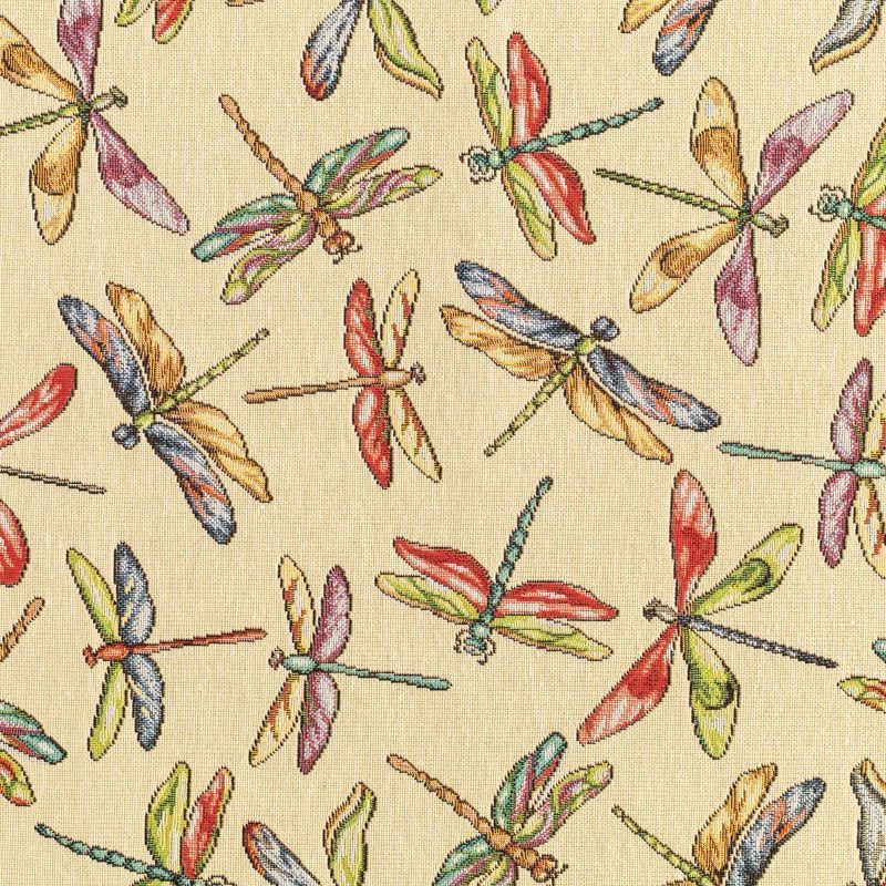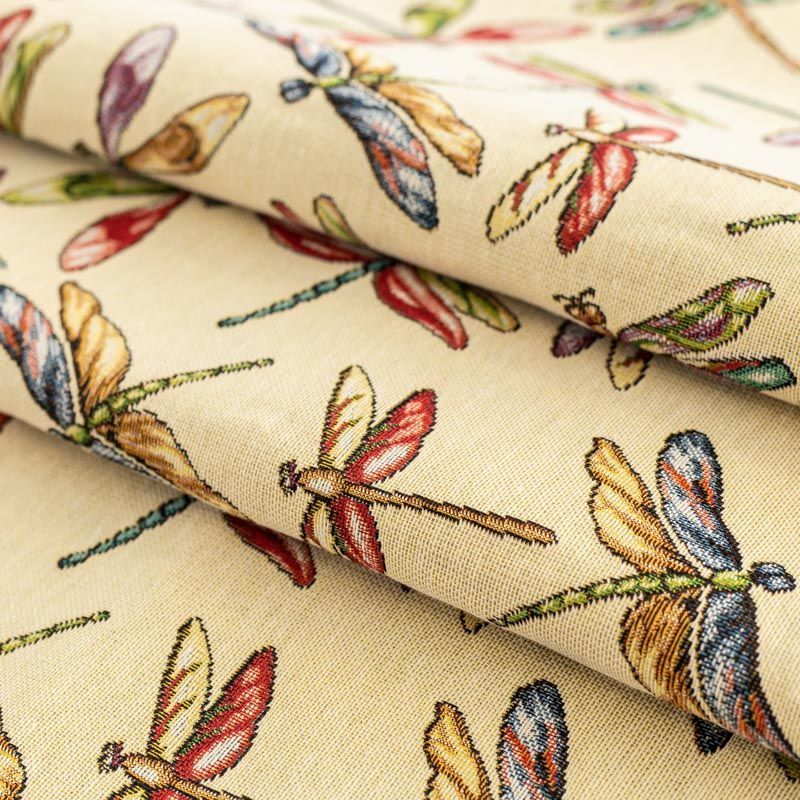 Гобелен представляет собой ткань, выполненную  перекрестным плетением нитей с одномоментным созданием сюжетной или орнаментальной композиции. Это плотный материал высокую прочность и износостойкость. Гобелен используют для пошива плотных светонепроницаемых штор, декоративного домашнего текстиля и аксессуаров, в мебельном производстве для обивки мебели. Так же применяется в рукоделии: модные кошельки, сумочки, пояса и другие аксессуары и при изготовлении дизайнерской одежды. Очень летний принт - цветные стрекозы на спокойном фоне натурального песочного оттенка.