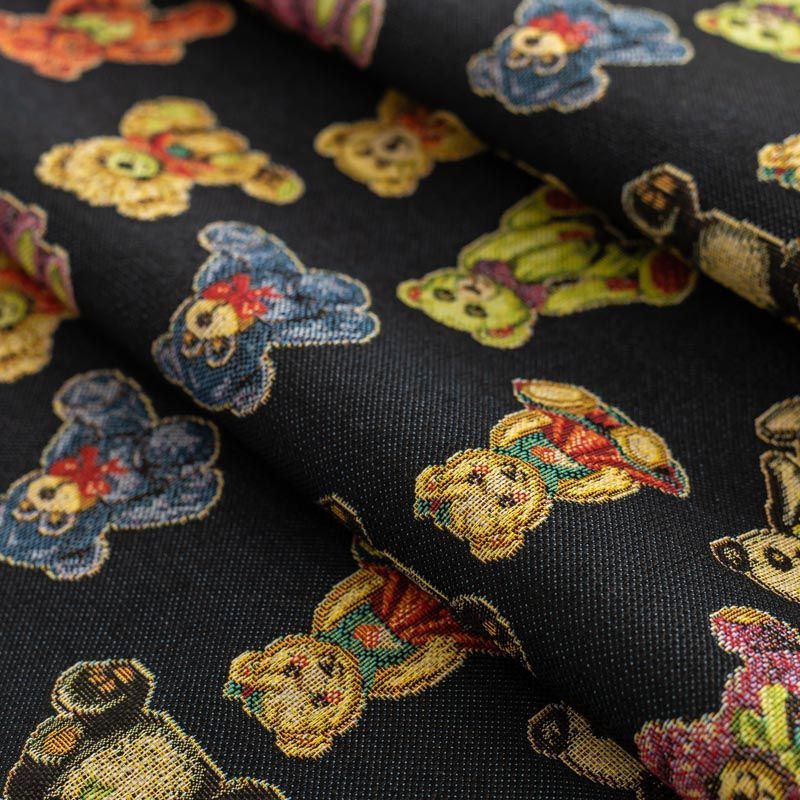 Гобелен представляет собой ткань, выполненную перекрестным плетением нитей с одномоментным созданием сюжетной или орнаментальной композиции. Это плотный материал высокую прочность и износостойкость. Гобелен используют для пошива плотных светонепроницаемых штор, декоративного домашнего текстиля и аксессуаров, в мебельном производстве для обивки мебели. Так же применяется в рукоделии: модные кошельки, сумочки, пояса и другие аксессуары и при изготовлении дизайнерской одежды. На черном фоне всеми любимые разноцветные игрушки - мишки-тедди.
