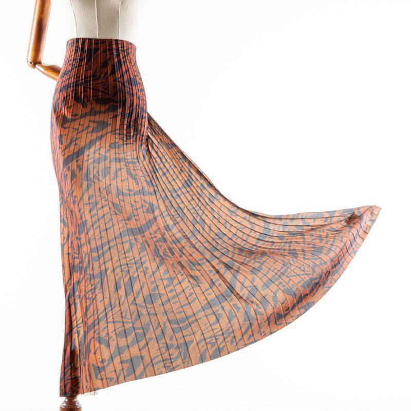 Готовый гофрированный купон из матовой креповой ткани терракотового оттенка с анималистичным принтом. Объем по низу 175 см, по талии 65 см, длина 110 см. Ткань раскроена полусолнцем, гофре заложено сверху вниз на увеличение. Ребро складки выделено черным цветом. Гофре визуально вытягивает и стройнит фигуру, именно поэтому уже который год юбки и платья гофре находятся в числе топовых вещей женского гардероба в классическом исполнении – миди и в пол, или в оригинальном ассиметричном крое. Можно использовать для клиновидной вставки в другую юбку, в спинку или рукав.