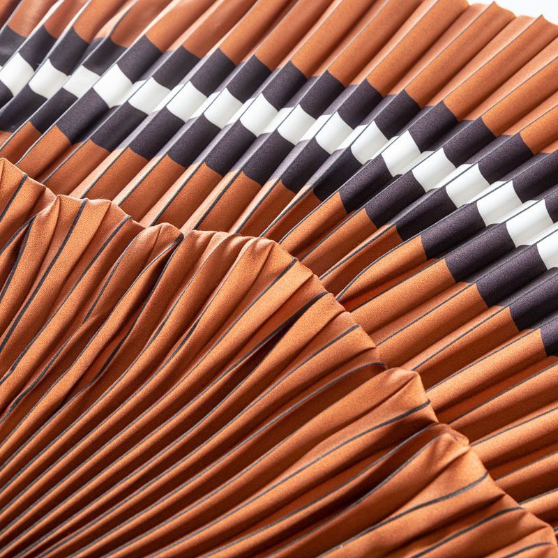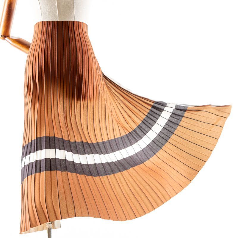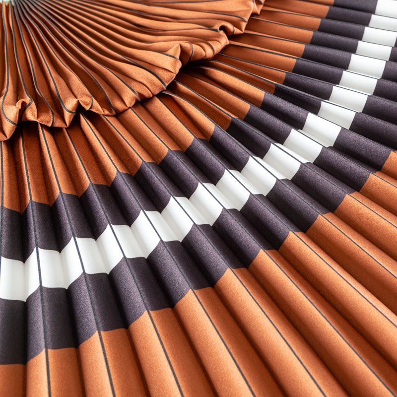 Готовый гофрированный купон из матовой креповой ткани рыжевато-коричневого оттенка с черно-белой полосой. Объем по низу 190 см, по талии 70 см, длина 80 см. Ткань раскроена полусолнцем, гофре заложено сверху вниз на увеличение. Ребро складки выделено черным цветом. Гофре визуально вытягивает и стройнит фигуру, именно поэтому уже который год юбки и платья гофре находятся в числе топовых вещей женского гардероба в классическом исполнении – миди и в пол, или в оригинальном ассиметричном крое. Можно использовать для клиновидной вставки в другую юбку, в спинку или рукав.