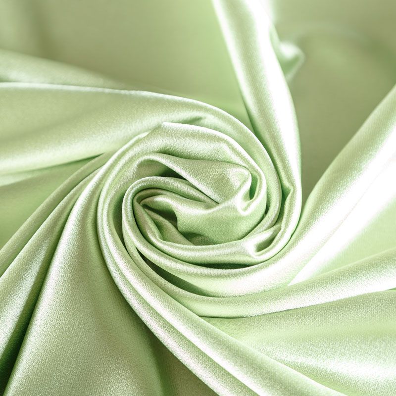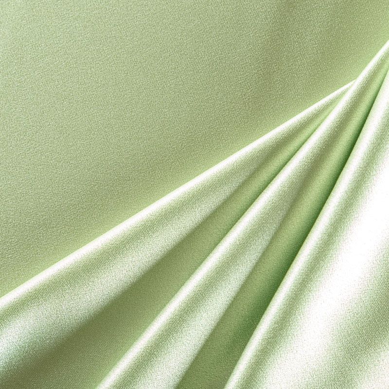 Итальянская ткань кади зеленого оттенка. Кади — это креп-атлас с красивым глянцевым блеском. Ткань с плотной фактурой, роскошно ниспадает, очень хорошо тянется, изумительно садится по фигуре и шикарно смотрится в изделии. Она хорошо драпируется, эффектно облегает. Подходит для пошива удлиненных платьев с драпировками, платья-футляра, брюк палаццо, юбки-карандаш, жакета, туники, кроп-топа, а также для вечерних, свадебных и выпускных платьев и костюмов.