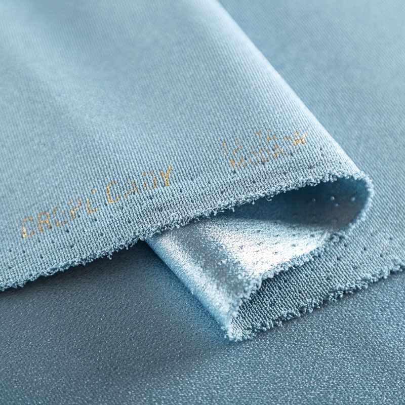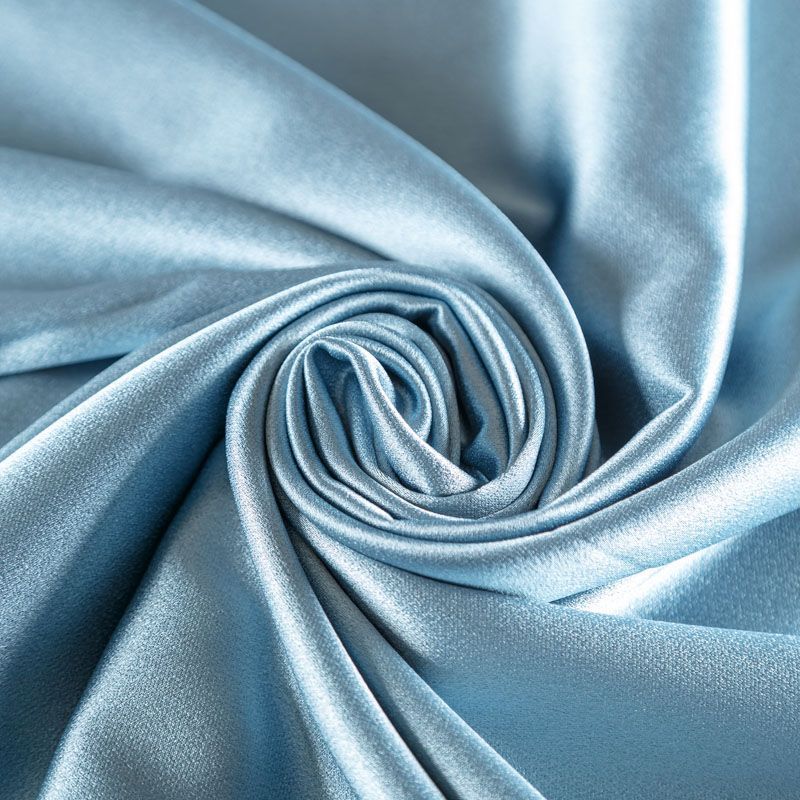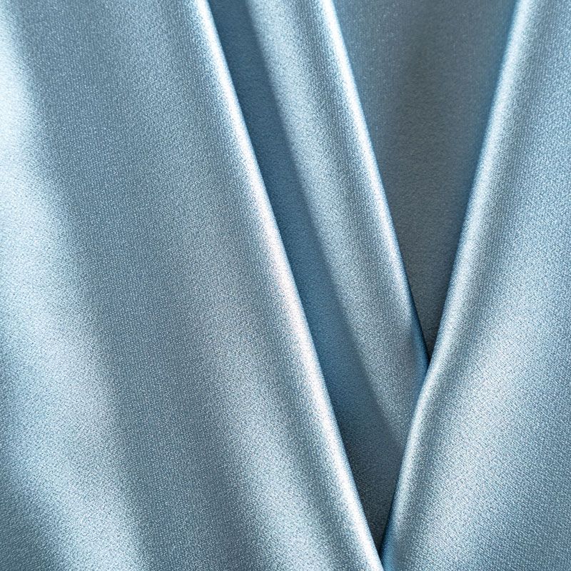 Итальянская ткань кади серо-голубого оттенка. Кади — это креп-атлас с красивым глянцевым блеском. Ткань с плотной фактурой, роскошно ниспадает, очень хорошо тянется, изумительно садится по фигуре и шикарно смотрится в изделии. Она хорошо драпируется, эффектно облегает. Подходит для пошива удлиненных платьев с драпировками, платья-футляра, брюк палаццо, юбки-карандаш, жакета, туники, кроп-топа, а также для вечерних, свадебных и  выпускных платьев и костюмов.