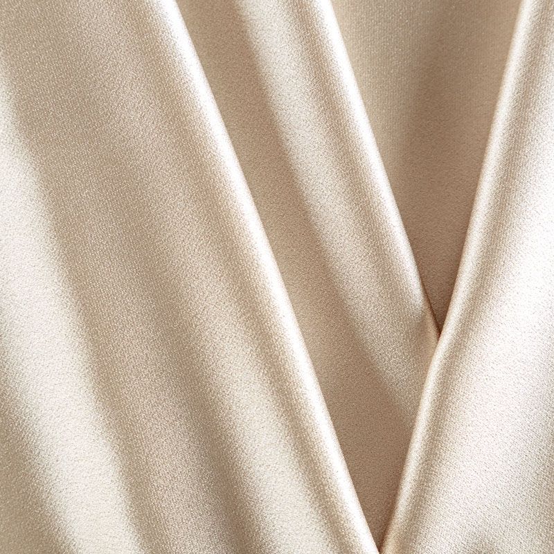 Итальянская ткань кади светло-золотистого оттенка. Кади — это креп-атлас с красивым глянцевым блеском. Ткань с плотной фактурой, роскошно ниспадает, очень хорошо тянется, изумительно садится по фигуре и шикарно смотрится в изделии. Она хорошо драпируется, эффектно облегает. Подходит для пошива удлиненных платьев с драпировками, платья-футляра, брюк палаццо, юбки-карандаш, жакета, туники, кроп-топа, а также для вечерних, свадебных и выпускных платьев и костюмов.