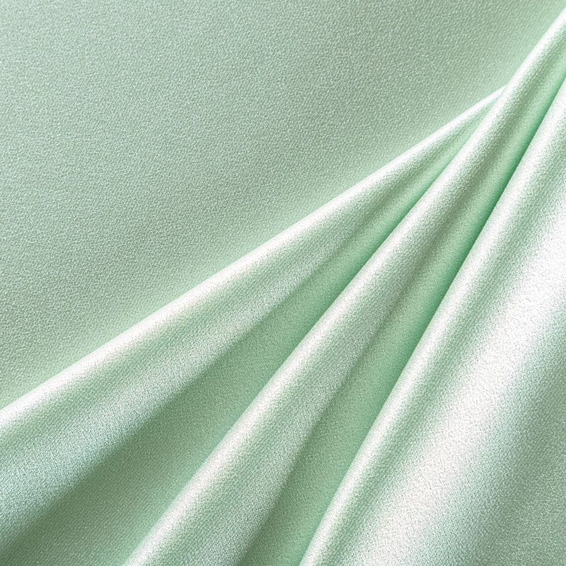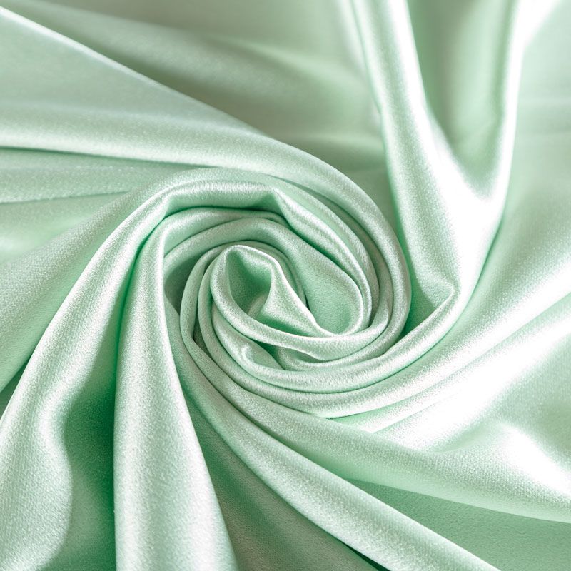 Итальянская ткань кади мятного оттенка. Кади — это креп-атлас с красивым глянцевым блеском. Ткань с плотной фактурой, роскошно ниспадает, очень хорошо тянется, изумительно садится по фигуре и шикарно смотрится в изделии. Она хорошо драпируется, эффектно облегает. Подходит для пошива удлиненных платьев с драпировками, платья-футляра, брюк палаццо, юбки-карандаш, жакета, туники, кроп-топа, а также для вечерних, свадебных и  выпускных платьев и костюмов.