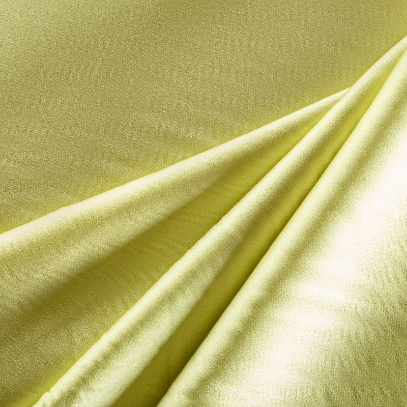 Итальянская ткань кади желто-зеленого оттенка. Кади — это креп-атлас с красивым глянцевым блеском. Ткань с плотной фактурой, роскошно ниспадает, очень хорошо тянется, изумительно садится по фигуре и шикарно смотрится в изделии. Она хорошо драпируется, эффектно облегает. Подходит для пошива удлиненных платьев с драпировками, платья-футляра, брюк палаццо, юбки-карандаш, жакета, туники, кроп-топа, а также для вечерних, свадебных и выпускных платьев и костюмов.