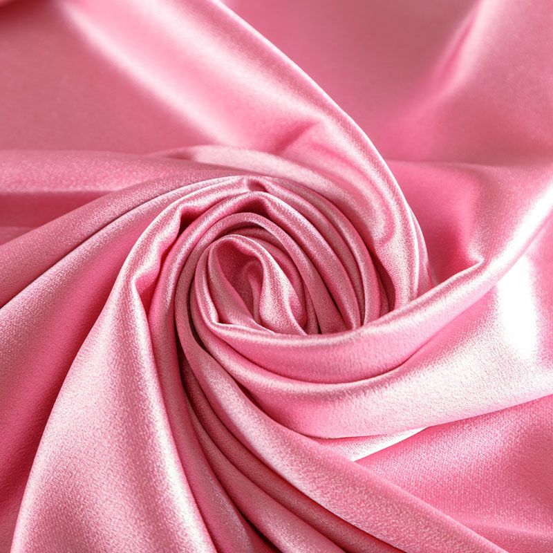 Итальянская ткань кади розового оттенка. Кади — это креп-атлас с красивым глянцевым блеском. Ткань с плотной фактурой, роскошно ниспадает, очень хорошо тянется, изумительно садится по фигуре и шикарно смотрится в изделии. Она хорошо драпируется, эффектно облегает. Подходит для пошива удлиненных платьев с драпировками, платья-футляра, брюк палаццо, юбки-карандаш, жакета, туники, кроп-топа, а также для вечерних, свадебных и  выпускных платьев и костюмов.