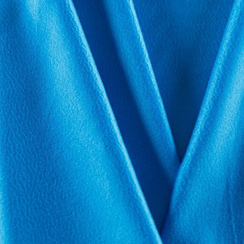 Итальянский пальтовый кашемир голубого оттенка. Ткань мягкая, пластичная, приятная на ощупь, гибкая, средней толщины, при этом высокой плотности. Поверхность имеет короткий ворс с характерной волной. Подойдет для пошива пальто, куртки, жакета, парки, кейпа, жакета или пончо.