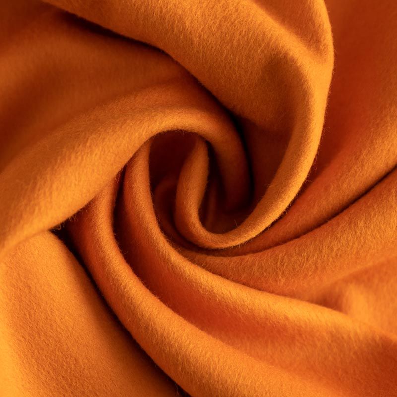 Пальтовый кашемир насыщенного оранжевого оттенка. Ткань необычайно мягкая, приятная на ощупь, гибкая, средней толщины. Поверхность имеет короткий ворс. Подойдет для пошива пальто, куртки, жакета, парки, кейпа, жакета или пончо.